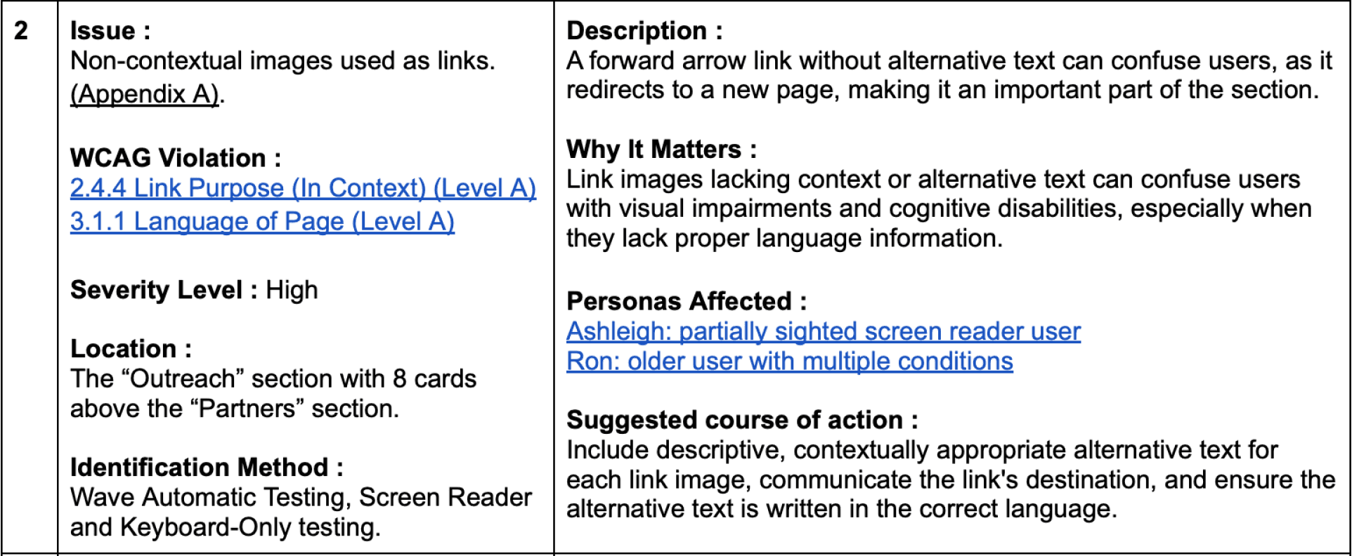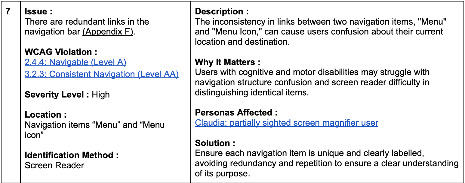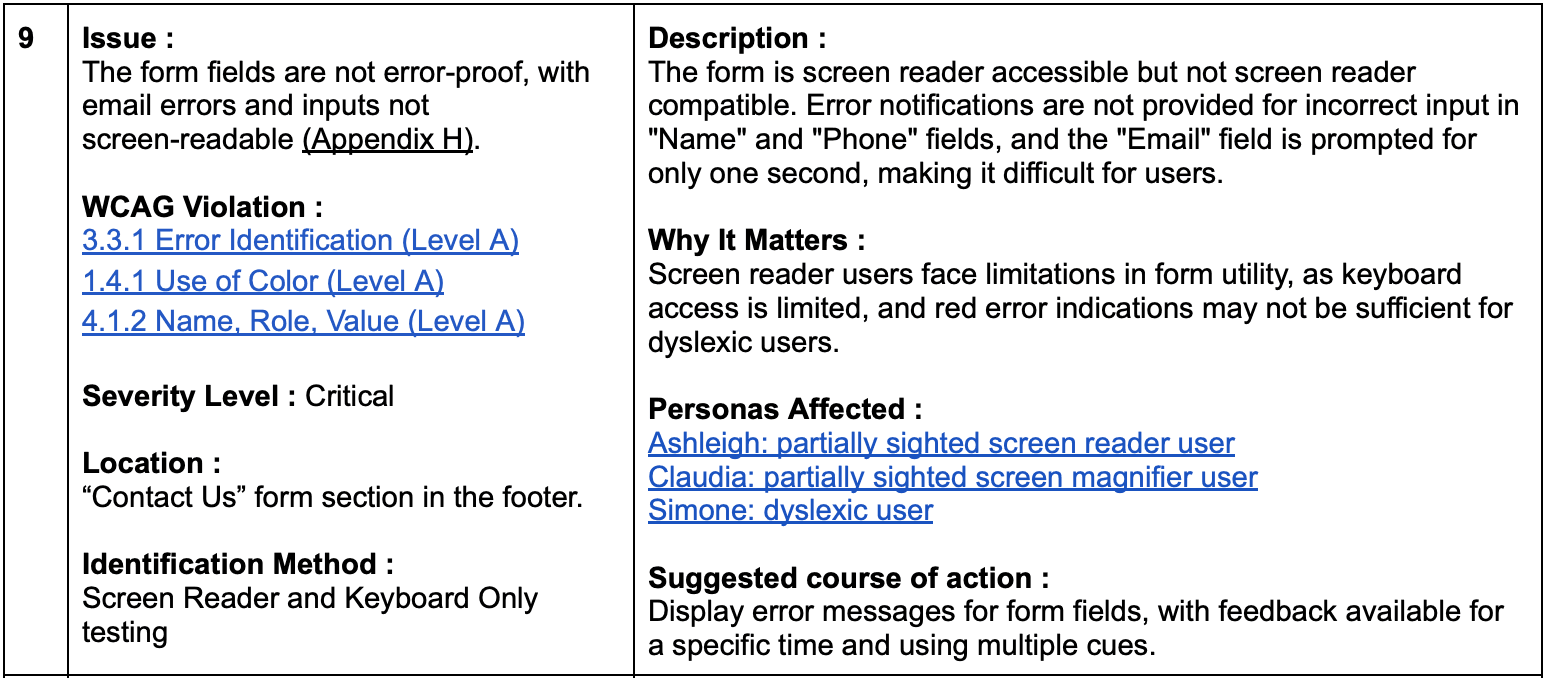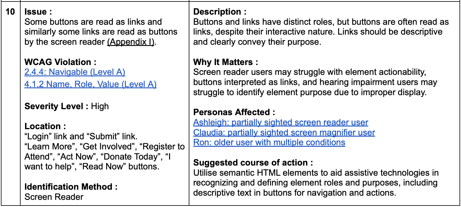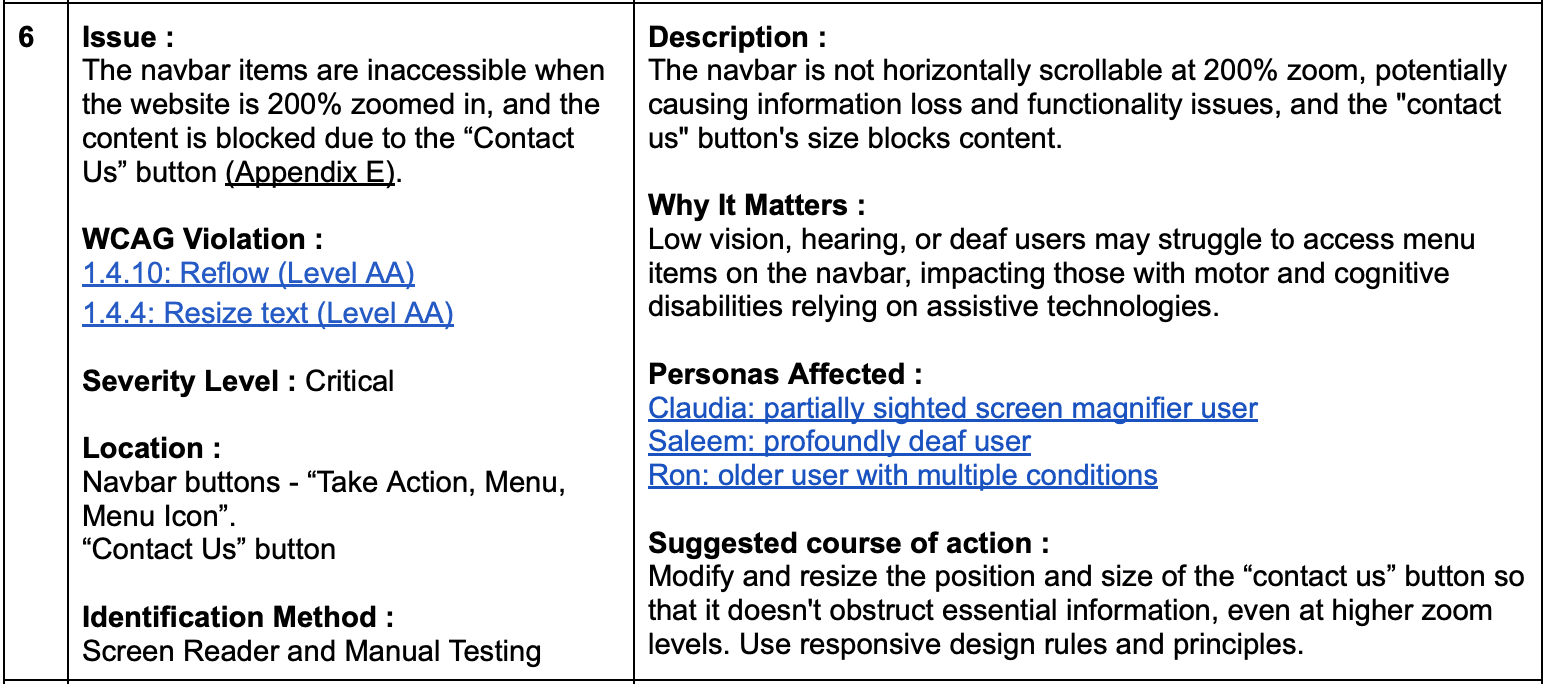 Below are the 10 identified Critical and High-severity errors. For each error, the following details are provided: the problem, a description of the problem, the error's location, the significance of the error, its severity, the identification method used, the specific WCAG 2.2 guidelines it violates, the disability personas it affects, a screenshot of the error, and the suggested corrective action.