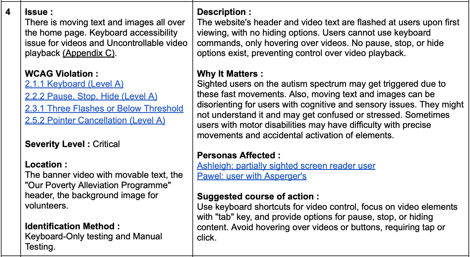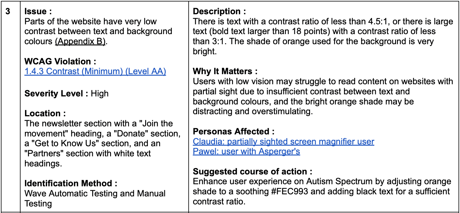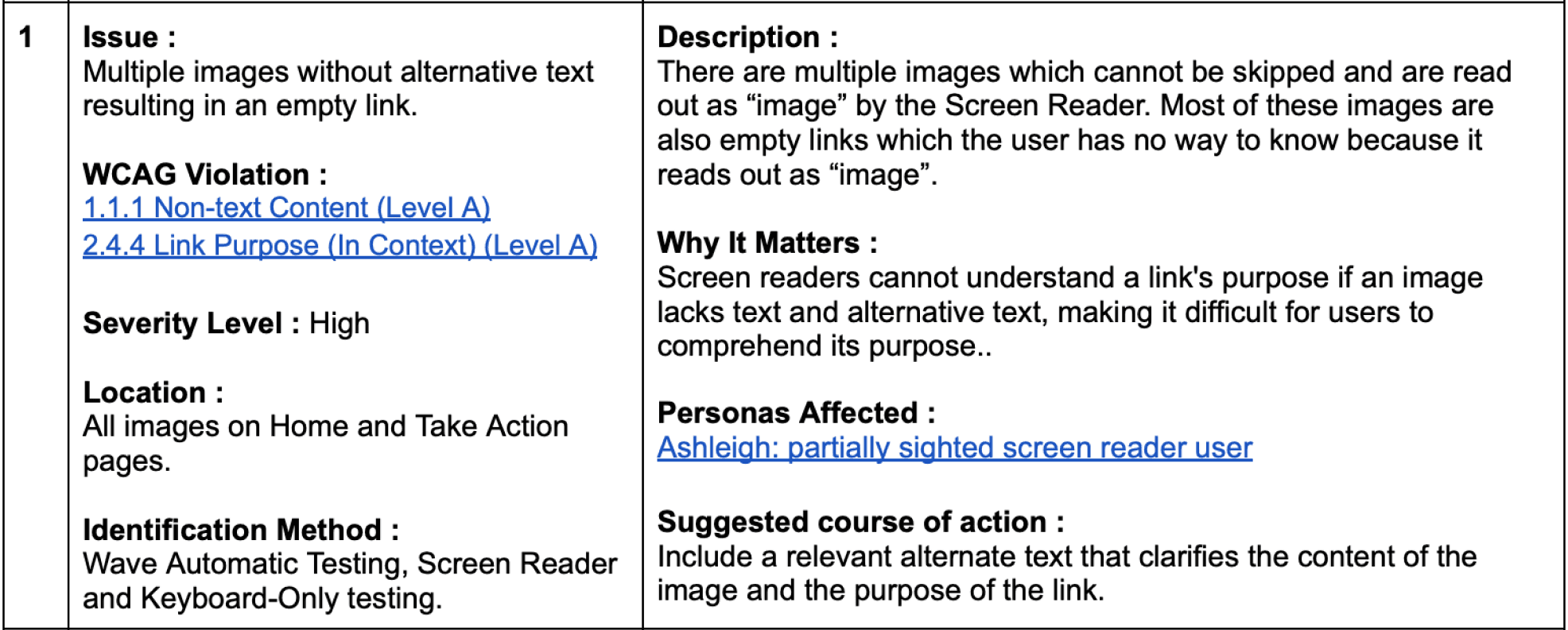 An assessment of the “Home” and the “Take Action” pages was reviewed to determine whether they conformed with the WCAG 2.1 guidelines up to an AA conformance level. The issues listed are for both the pages and a severity level is assigned to each one of them based on the impact it will cause on the user experience of individuals with disabilities.