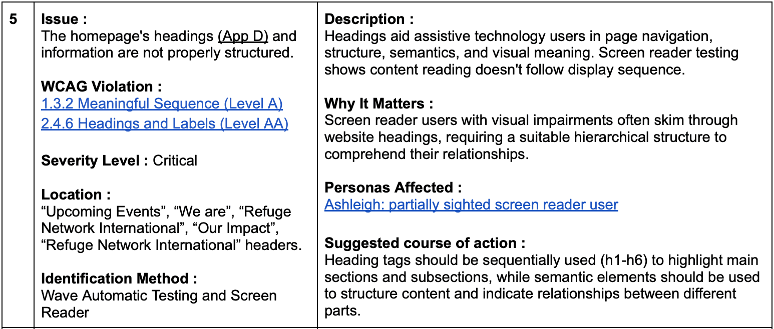 An expert accessibility review was conducted for a non-profit organisation website “Refuge Network International” to learn about how accessible the website is for people with access needs. The review provided steps to be taken to fix the most important accessibility issues for using the website’s service.